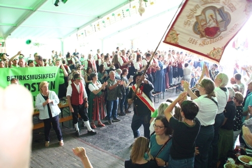 Mit einer Fahnenabordnung starteten wir an diesem Sonntagmorgen zur Feldmesse und erwiesen dem MV Harmonie Altach die Ehre zu diesem großartigen Fest, das wohl Geschichte schreiben und noch lange in Erinnerung bleiben wird. Der Ton, um den es nicht nur in der Musik, sondern auch im Leben geht, war das Thema bei der Feldmesse und bei den Fürbitten. Am Mittag stellten wir uns zum Gesamtchor beim Kirchplatz in Altach mit 1300 Musikanten zusammen und spielten drei gemeinsame Märsche. Anschließend ging es im Festumzug mit 31 Musikkapellen in Richtung Festplatz. Bgm. Fritz Maierhofer ließ es sich nicht nehmen und stand uns als Festführer zur Verfügung. Dafür ein herzliches Dankeschön.